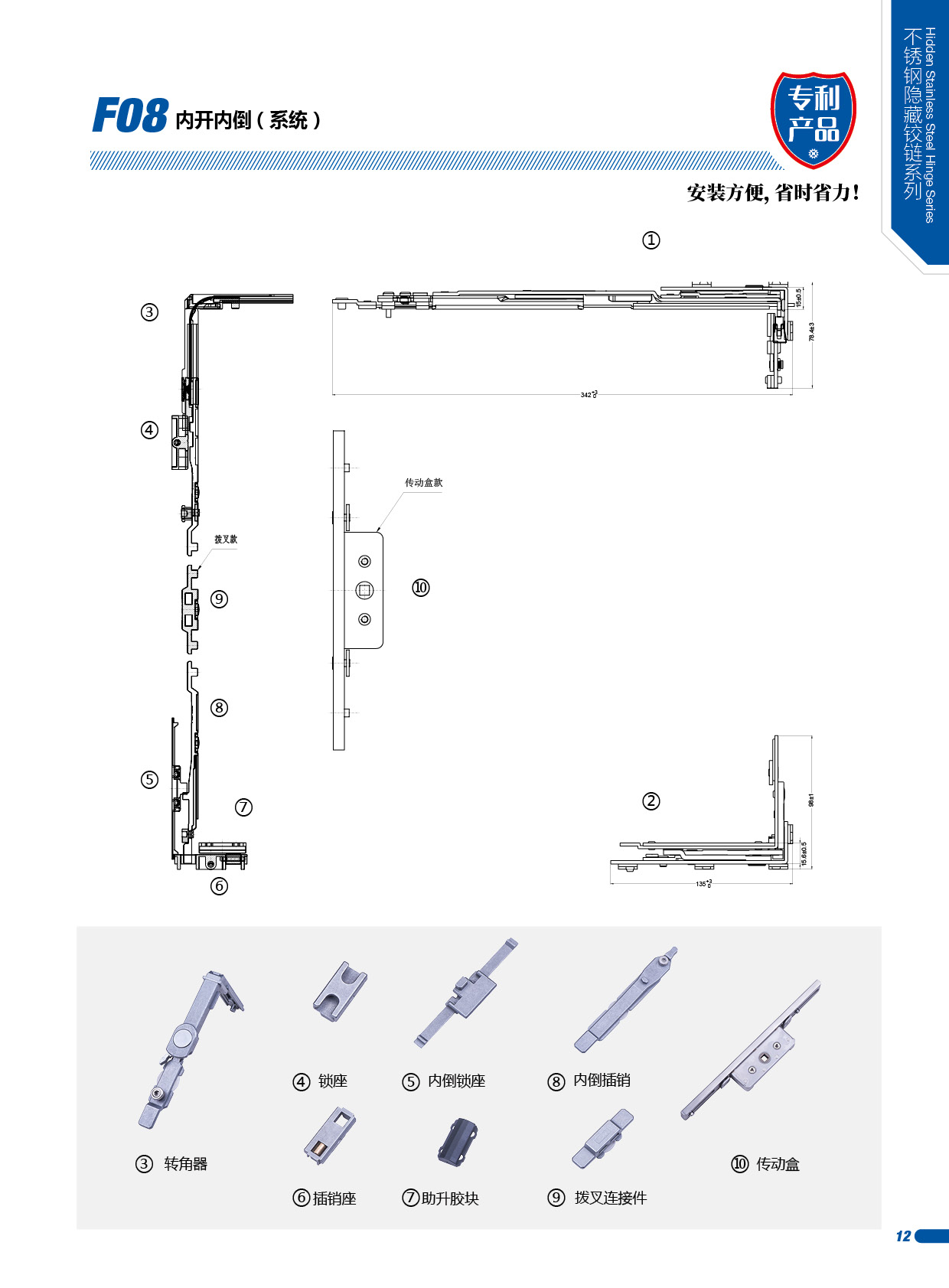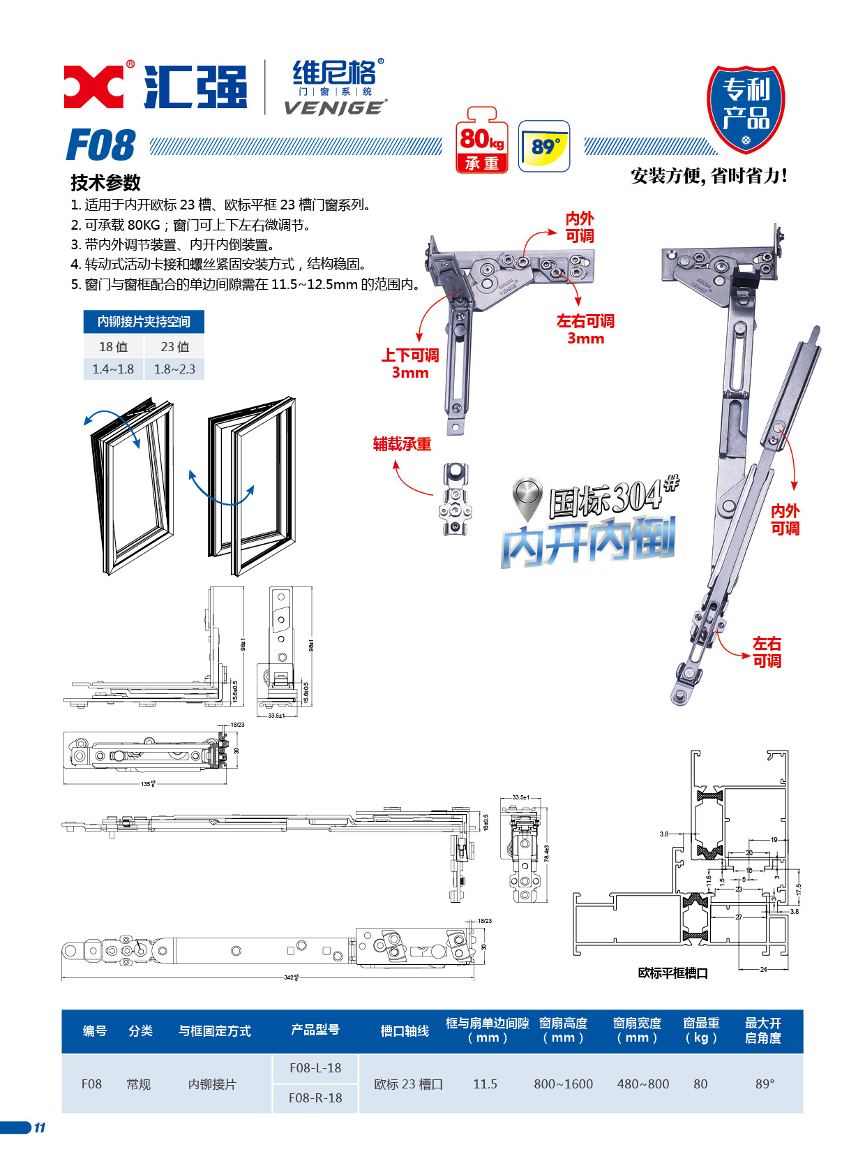 1.适用于内开欧标23槽、欧标平框23槽门窗系列。 2.可承载80KG;窗门可上下左右微调节。 3.带内外调节装置、内开内倒装置。 4.转动式活动卡接和螺丝紧固安装方式,结构稳固。 5.窗门与窗框配合的单边间隙需在11.5~12.5mm的范围内。
